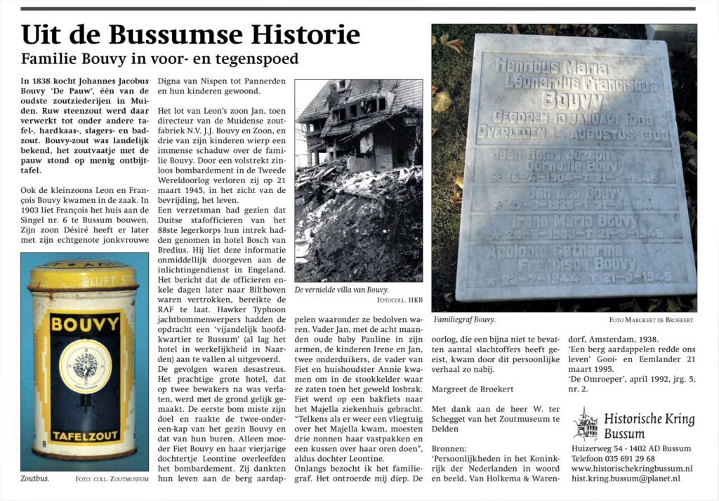 Dit resulteerde weer in het artikel ‘Familie Bouvy in voor- en tegenspoed’, dat in november 2013 in BussumsNieuws verscheen. Ik kwam eigenlijk ruim tekort aan de 400 woorden die voor deze rubriek zijn gereserveerd. Daarom op deze plek, voorafgaande aan het artikel zelf, nog iets meer over de geschiedenis van zoutziederijen en de overlevenden van de ramp van 21 maart 1945.