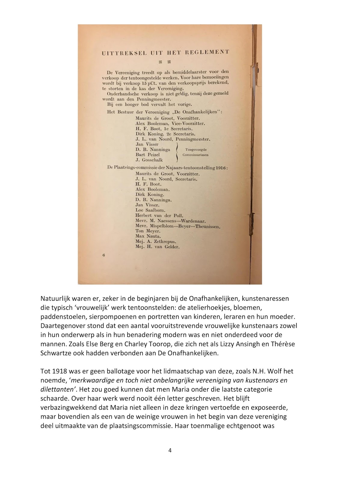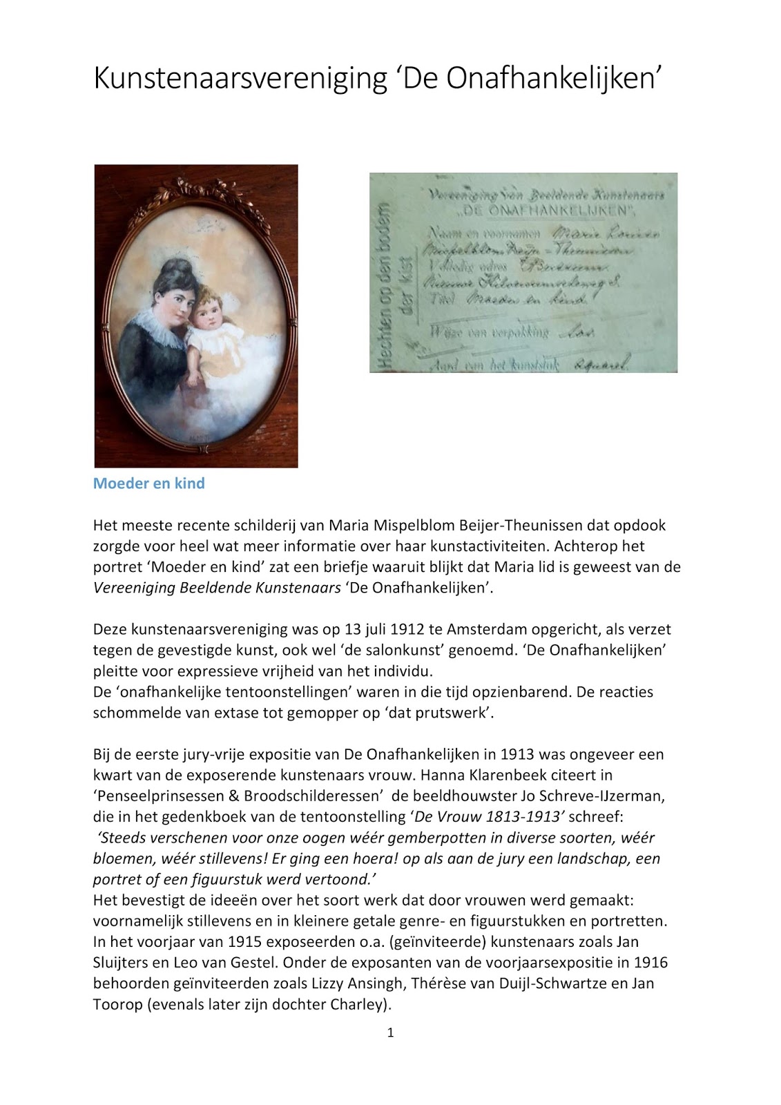 Onverwachts kan ik een nieuw hoofdstuk toevoegen aan het bijzondere, en trieste levensverhaal van Maria Mispelblom Beijer-Theunissen. En wel dat over de Amsterdamse kunstenaarsvereniging ‘De Onafhankelijken’ waar, zoals nu bleek, Maria zich korte tijd bij had aangesloten. Deze club bestaat overigens nog steeds.