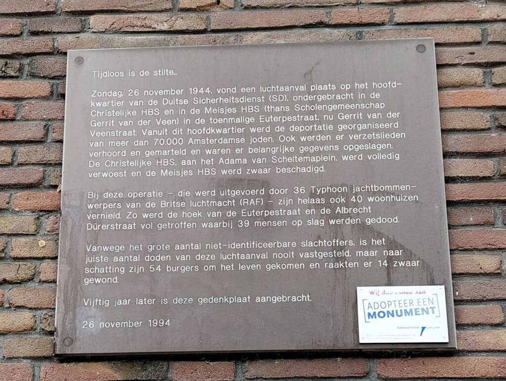 Aan de muur van het Gerrit van der Veen College hangt een herdenkingsplaquette ter nagedachtenis aan alle onschuldige slachtoffers, die bij het bombardement in de Euterpestraat zijn omgekomen.