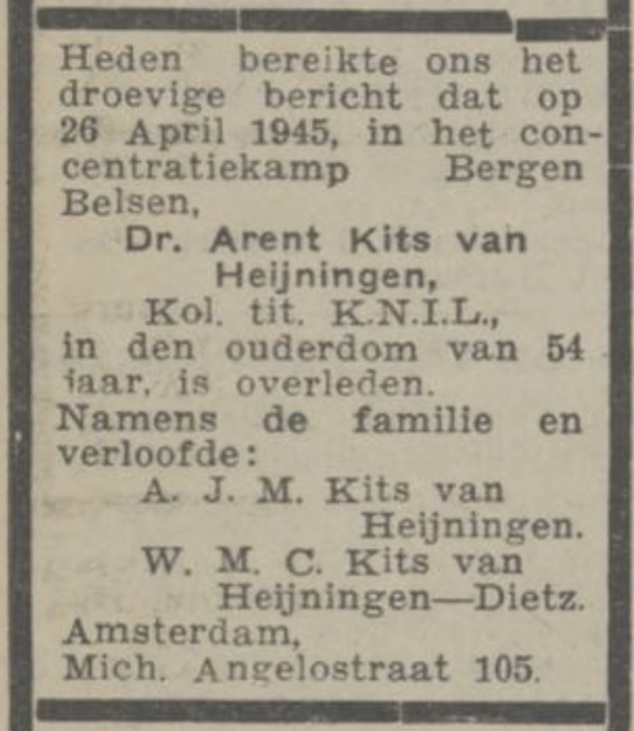 Op 15 april 1945, elf dagen na de bevrijding van concentratiekamp Bergen Belsen, overleed Arent Kits van Heijningen.